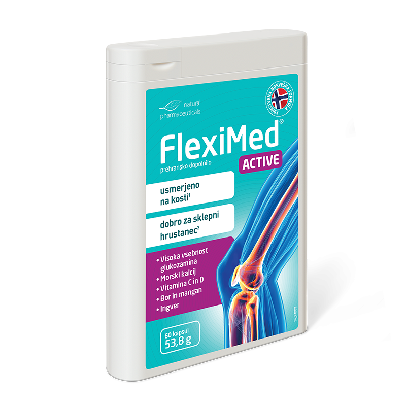 FlexiMed® Active, dopolnilo za podporo sklepom, kostem in mišicam. Zdaj v novi, izboljšani recepturi – z glukozaminom rastlinskega izvora GlucosaGreen® in visoko vpojnim kalcijem Aquamin®.